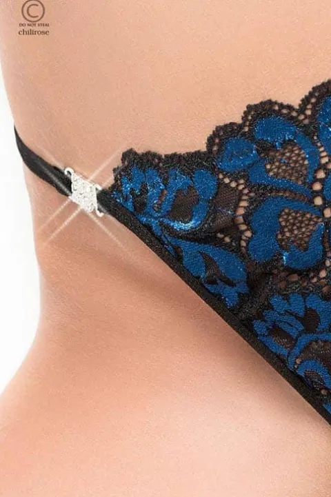 Elegant Chilirose Blue Lace Thong with Rhinestones with an exquisite black/sapphire blue floral lace design embellished with shiny rhinestones. Features a cotton gusset for comfort.