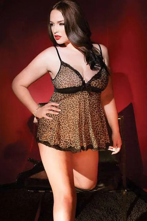 Coquette Leopard Mesh Babydoll Plus with contrasting scalloped lace trim on cups and hem, front Lycra band, centre front bow and adjustable straps. Includes matching G-string with lace trim.