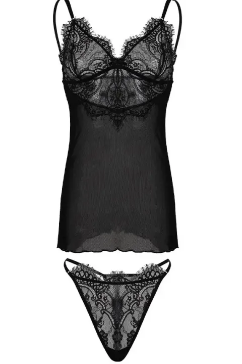 Dkaren Jovita Sheer Black Mesh and Floral Chemise Set consists of sheer black floral lace on the soft cups, with luxurious scalloped eyelash lace on the top of a plunging neckline and a ruched hemline. Sheer black mesh forms the body and hugs your curves. The back features a lace detail at the top matched with sheer mesh showing the matching sexy Gstring.