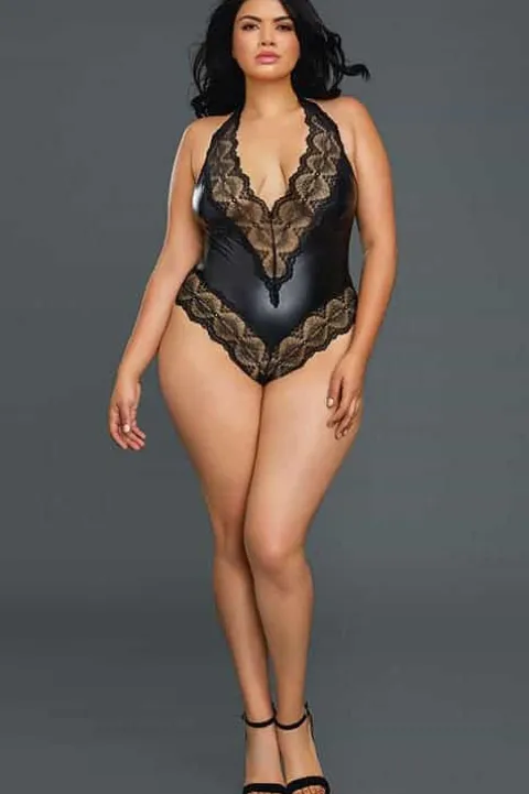 Dreamgirl Faux Leather and Lace Teddy features high-sheen faux leather, with fine patterned scalloped lace at the neckline and hemlines. A plunging “V”neck front highlights the bust, connecting to a lace strap running down the body at back. The high cut sexy thong cut back shows of your bottom beautifully.