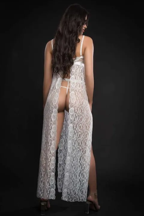 GWorld 2PC Strappy Halter Lace Night Gown is a romantic night gown in elegant sheer floral lace with open back, side slits, balconet bra and unique halter architectural straps. Delicate charm details adds bling. Comes matching high waist strappy panty.