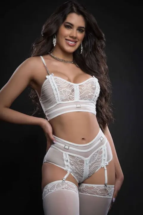 GWorld Zippered Bustier and Garter Boyshort from the Blackout Collection features a sheer lace bustier matched with romantic pearls on the straps, beautiful embroidery, sexy rhinestone charms and sensual front zipper. The matching garter boyshort hugs your curves and highlights your assets. Comes with matching lace top stockings to complete this sexy outfit
