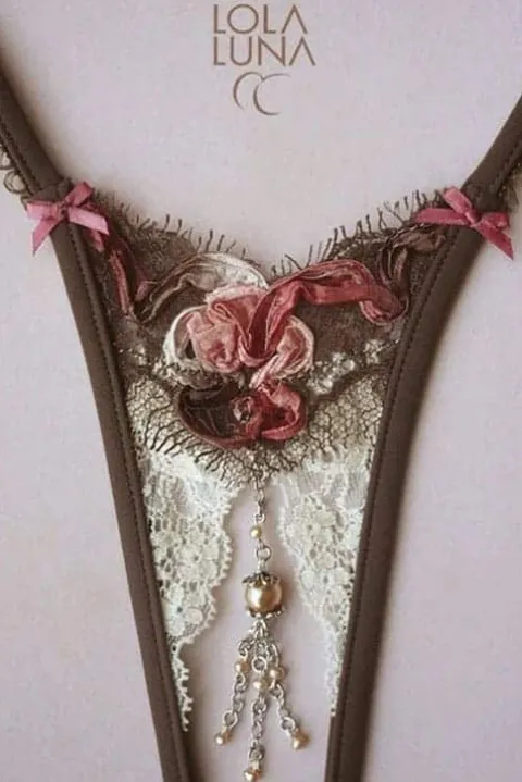 Lola Luna Montecarlo Open G String in brown, raspberry and rose coloured embroidered lace against an ivory centre lace opening with a real freshwater pearl. A stunning gift for the sophisticated woman.