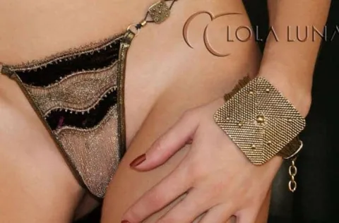 Lola Luna Sherazade G-String, a gorgeous and elegant Lola Luna g-string features metallic gold strings with gold-plated enclosures and velveteen front panel motif in deep burgundy and gold plated jewels on side. Stunning.