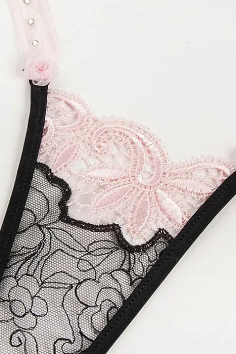 Lola Luna Zambie G String, stunningly sheer in black embroidered tulle and accented with pale pink lace. The side strings are organza embellished with Swarovksi crystals.