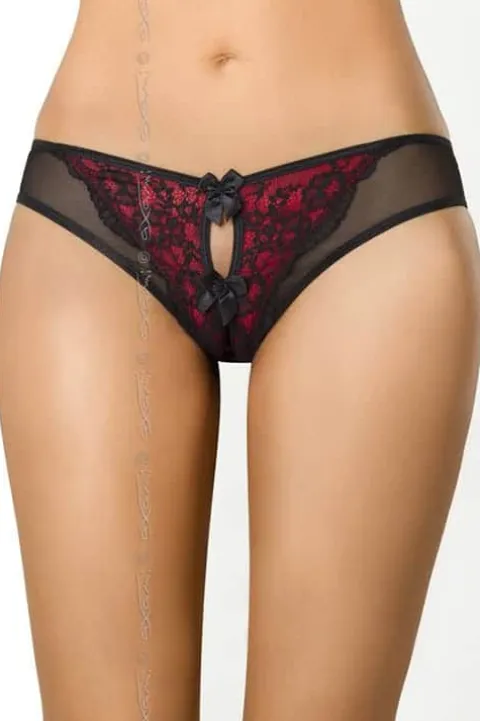 Axami Tamarillo Sorbet Brasiliana String is a stunning design with bold keyhole cutouts at the front and back with black bows each side. Sensual black blossom embroidery on a red background creates a beautiful motif which gives way to sheer material which goes all around to the back.