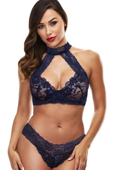 Baci Blue Lace Halter Bikini Set made from exquisite lace with halter neck detail bra and matching cheeky Brazilian cut panty.
