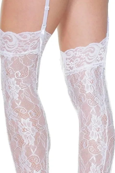Coquette White Lace Thigh Highs with Rhinestones feature a beautiful floral pattern with rhinestones scattered throughout, scalloped lace tops and an enclosed toe make these perfect for weddings.