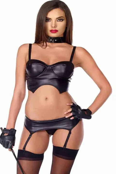 Forplay faux leather bustier in matte finish with padded cups, backside hook and eye closure.