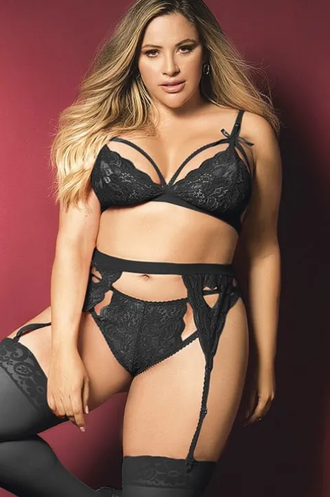 Mapale Black 3 Pce Lace Bra Set features a Bra, Thong, and Garter belt made from soft stretch lace to hug your figure. Both the Garter and Thong feature sexy heart designs – perfect for a romantic occasion. The Bra has decorative bows and peek-a-boo cups and adjustable straps. The garter has a high waist to complete this sexy look